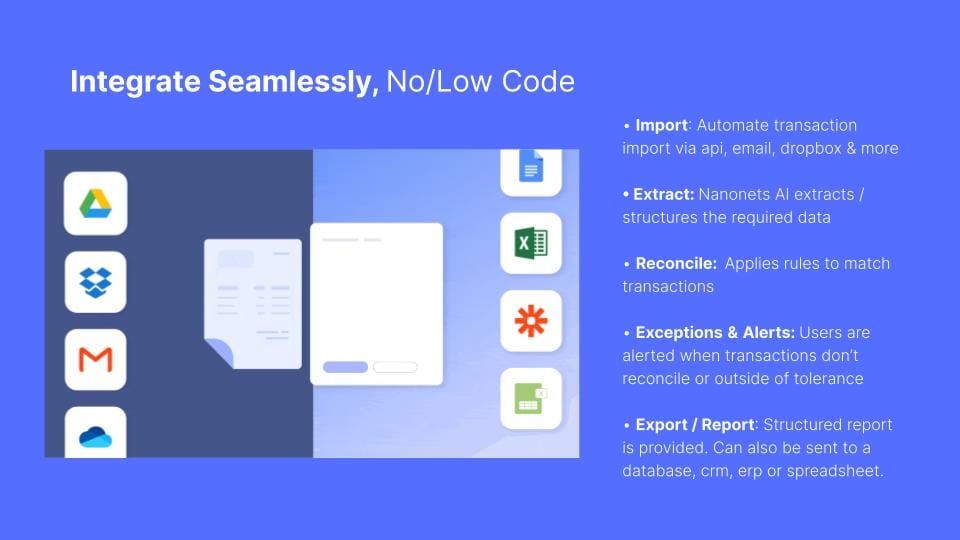 Nanonets is designed to scale with the evolving needs of businesses, from small startups to large enterprises. Its cloud-based architecture ensures scalability, reliability, and performance, even with large volumes of data and complex reconciliation requirements.