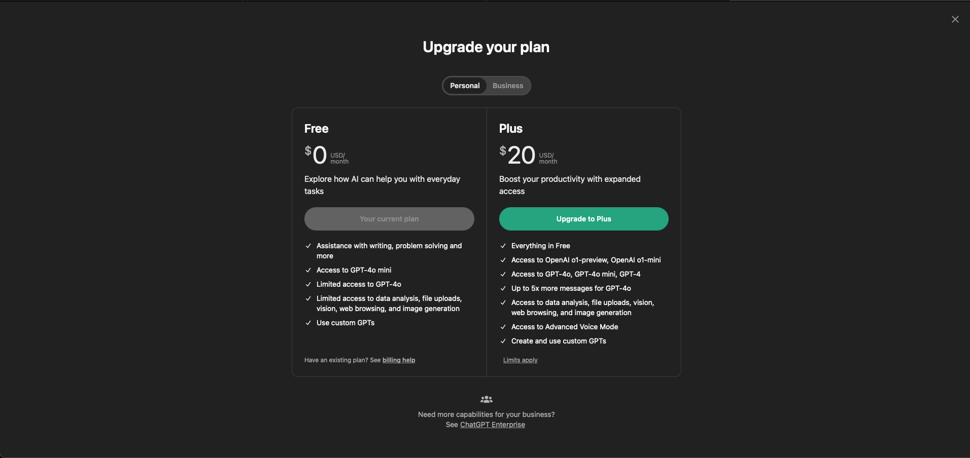 - Choose a Subscription Plan: OpenAI offers both free and paid versions of ChatGPT. The free plan provides access to the GPT-4o mini and limited access to GPT-4o model, while the paid subscription (ChatGPT Plus) unlocks access to more advanced models like OpenAI o1-preview and OpenAI o1-mini, which comes with enhanced capabilities.