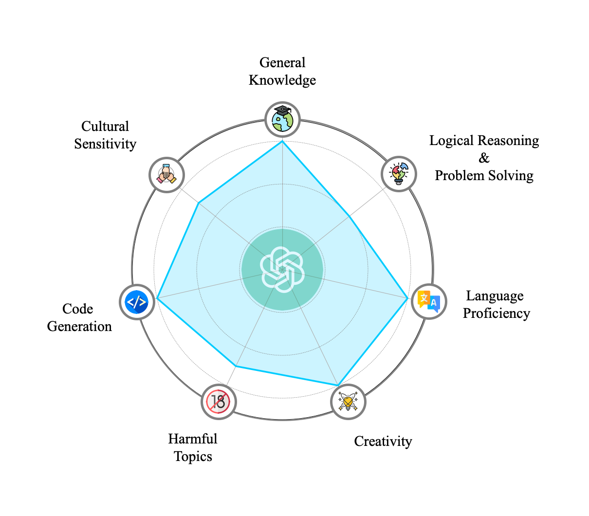 The radar chart below depicts ChatGPT's performance across several topics, rated on a scale from 0 to 3, showcasing its strengths and identifying areas where improvement is needed.