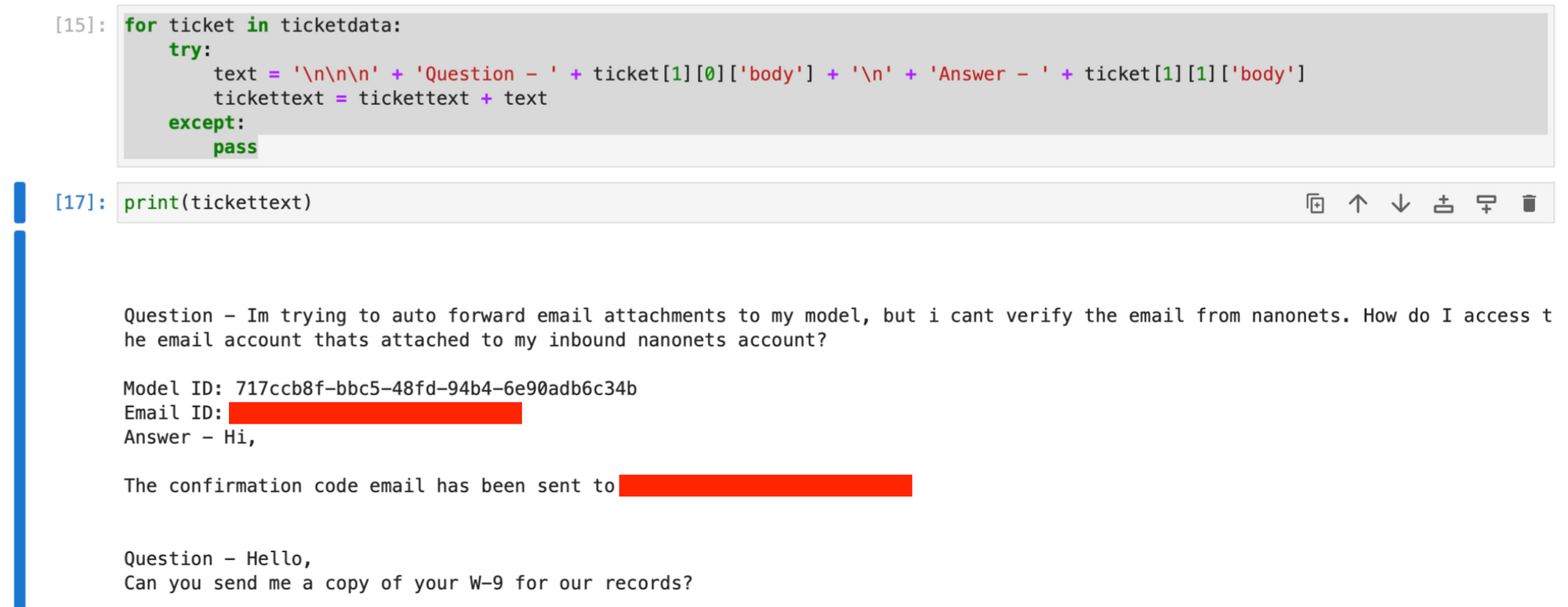 We then move on to create a text based string having the queries and first responses from all retrieved tickets, using the ticketdata array.
