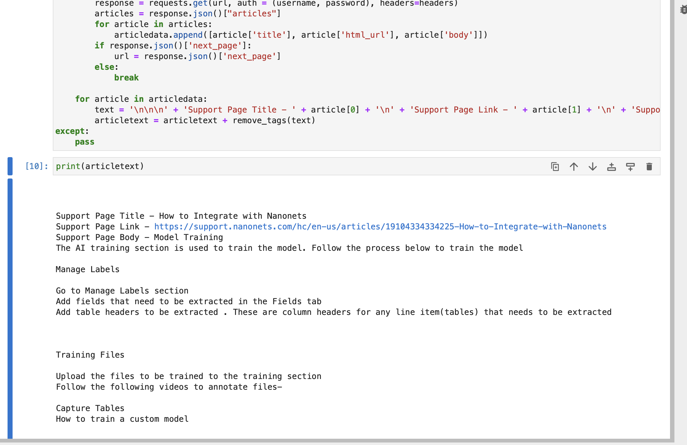Optional : You can also fetch data from your Zendesk Support articles to expand the knowledge base further, by running the below code.