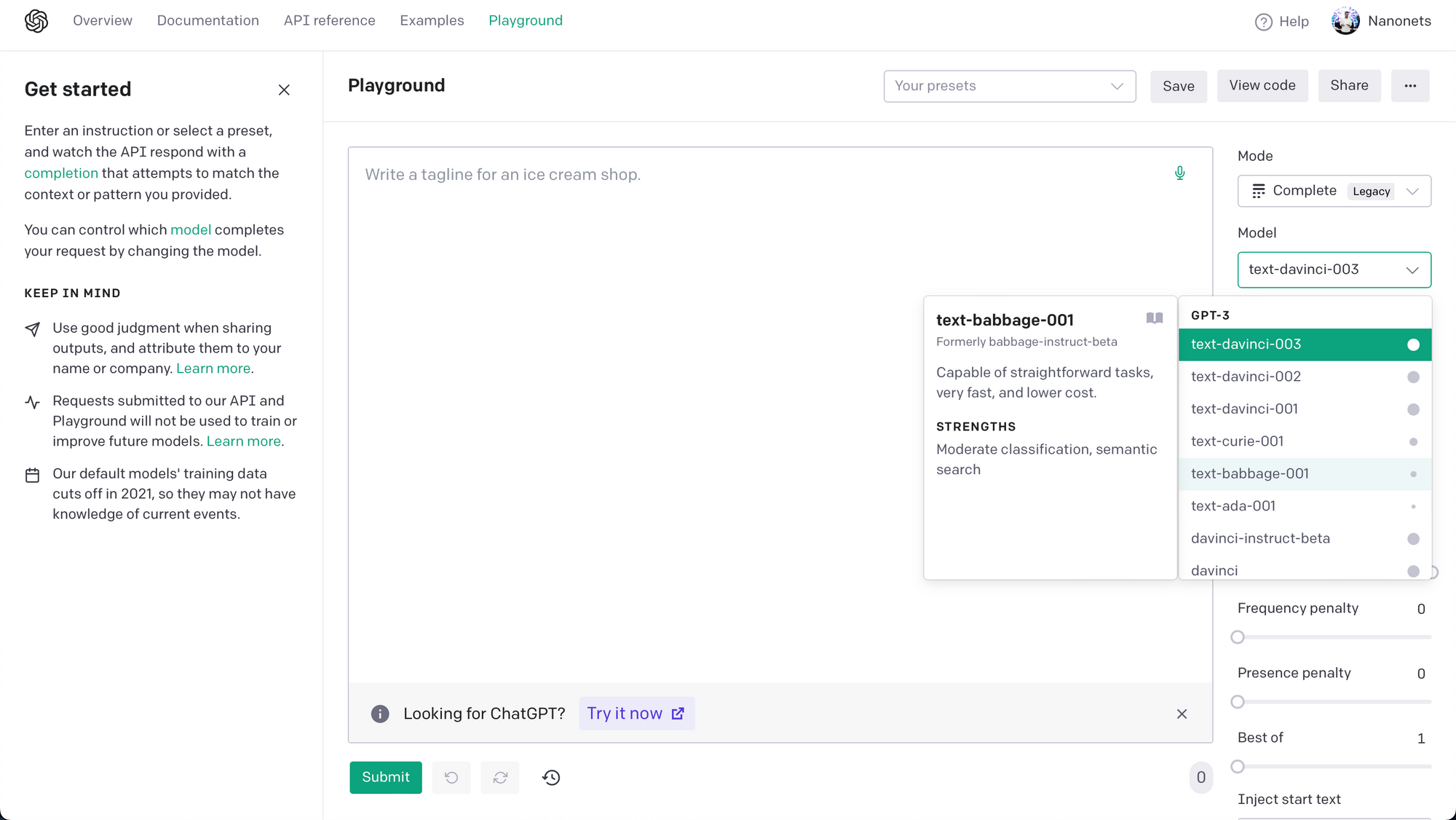 OpenAI Playground is an effective platform for testing and comparing different models.
