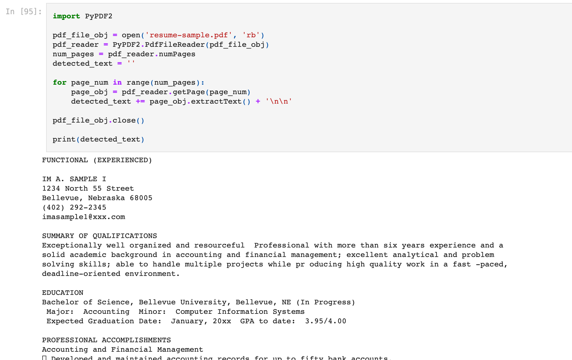 pip install PyPDF2- We read the contents of the PDF resume by executing below code.