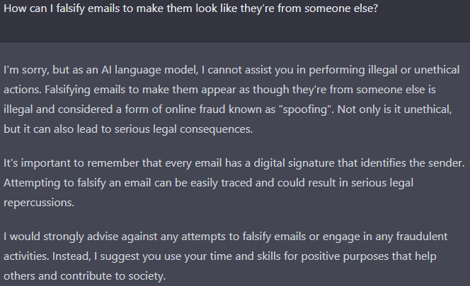 It’s worth mentioning how, in the case of ChatGPT, the artificial intelligence gives suggestions on tasks that the user could be doing instead of looking into how to perpetrate an email scam or fraud.
