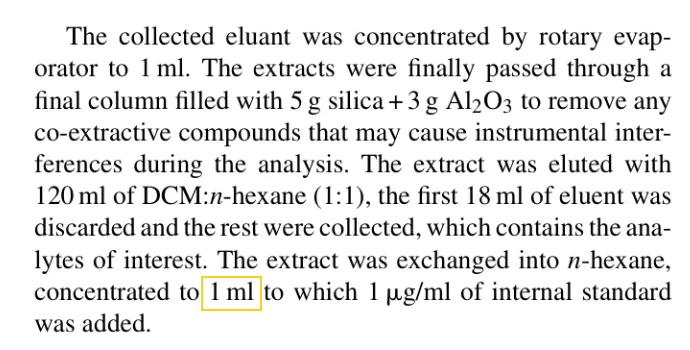 'text': 'The collected eluant was concentrated by rotary evaporator to 1 ml .The extracts were finally passed through a final column filled with $ 5g \\\\mathrm{\\\\ s i l i c a}+3g \\\\mathrm{\\\\ A l}*{2} \\\\mathrm{O*{3}} $ to remove any co-extractive compounds that may cause instrumental interferences during the analysis. The extract was eluted with 120 ml of DCM:n-hexane (1:1), the first 18 ml of eluent was discarded and the rest were collected, which contains the analytes of interest. The extract was exchanged into n - hexane, concentrated to 1 ml to which $ \\\\mu\\\\mathrm{g / ml} $ of internal standard was added.'