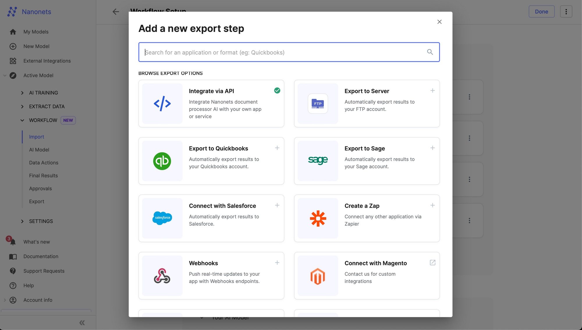 Once done, navigate towards the Integrate section on the left navigation pane, which gives ready to use code snippets to extract line items, flat fields and tables using the Nanonets API.