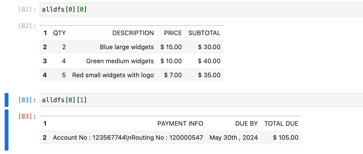 We can see that the two tables present on the invoice pdf have been detected and stored as dataframes on the first page alldfs[0], and the two tables can be accessed at alldfs[0][0] and alldfs[0][1].