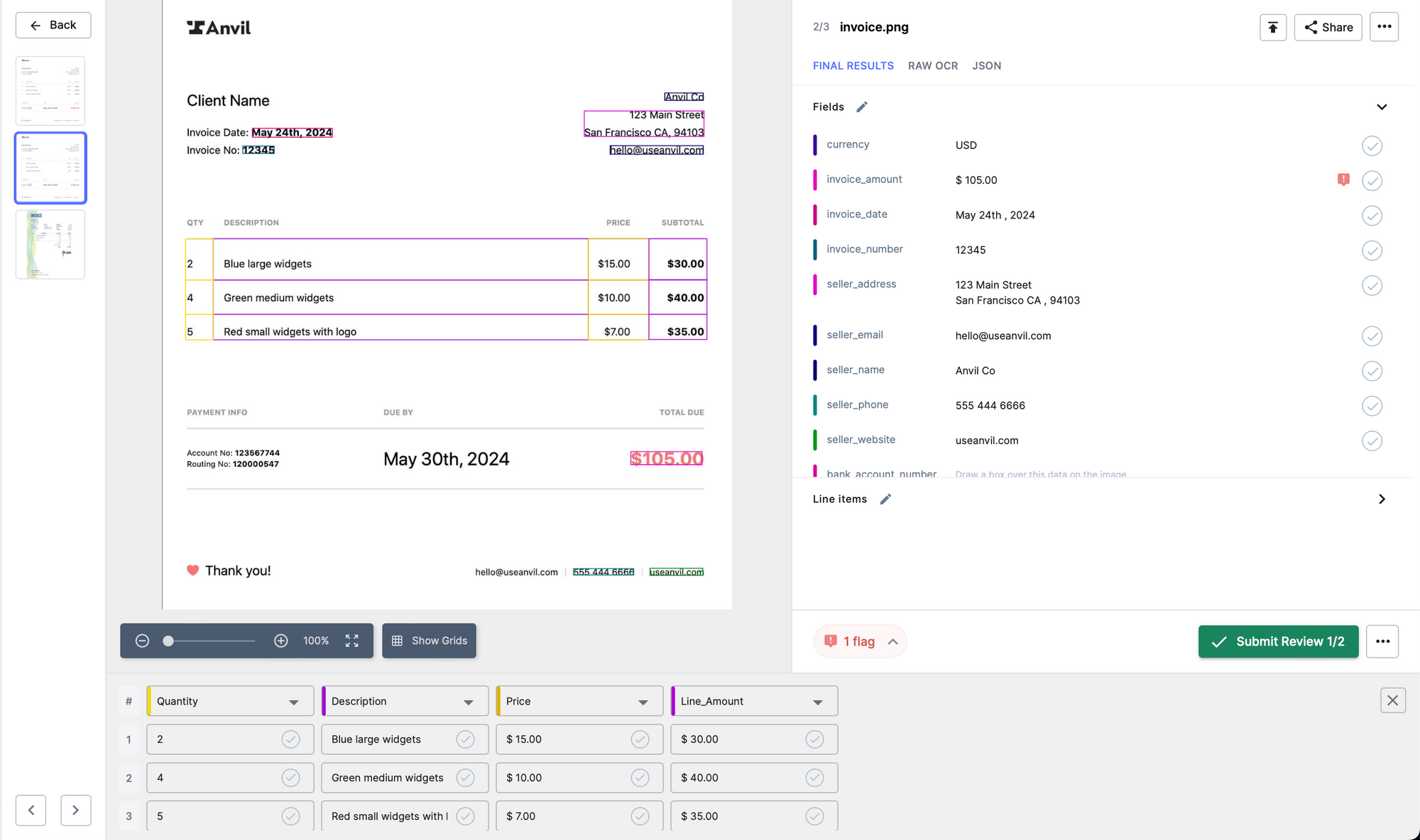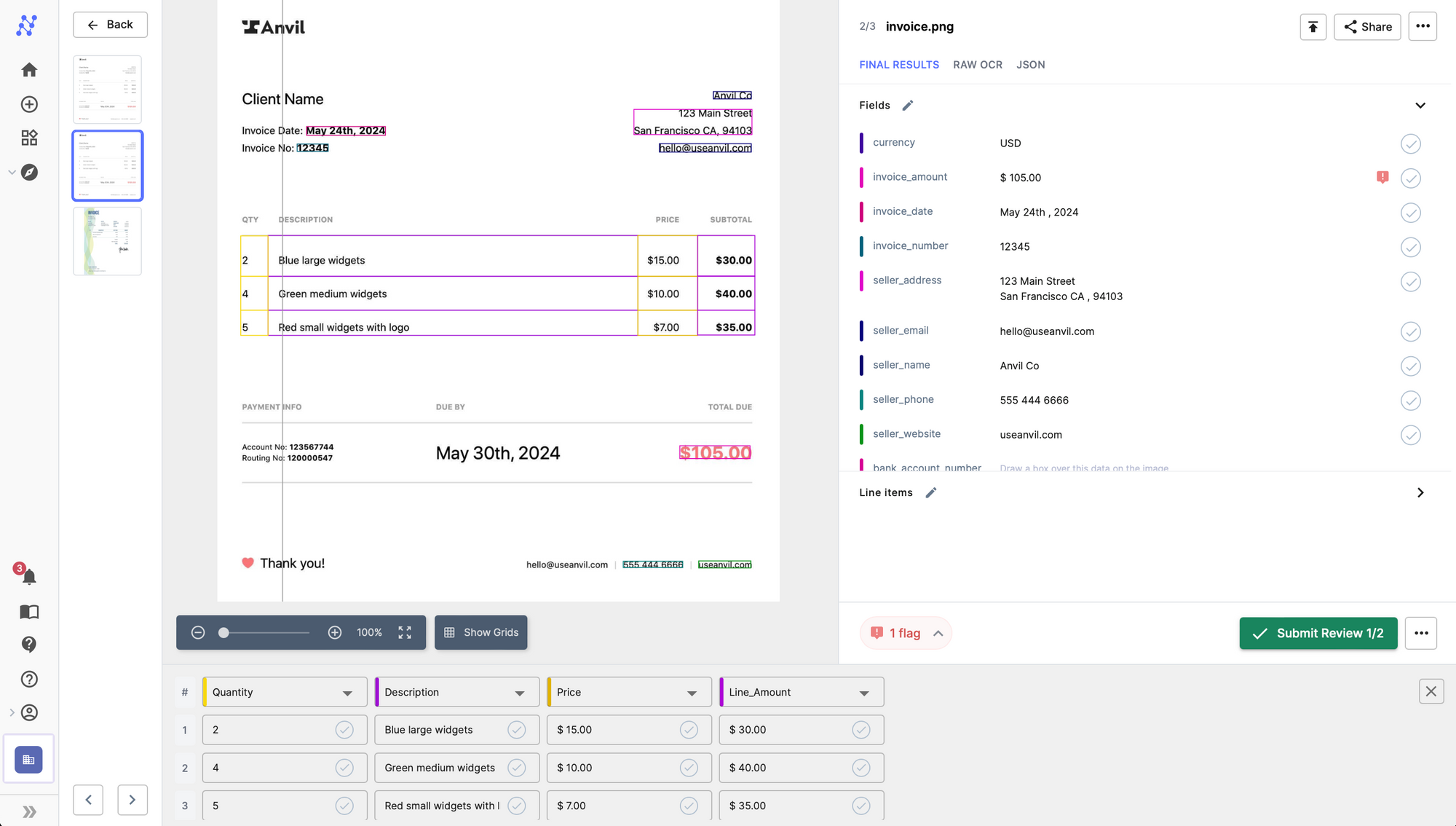 You can also use our online platform to set up an automated workflow and extract line items and tables from PDF files and images, configure external integrations with popular ERP / software / databases and set up approval and validation rules.