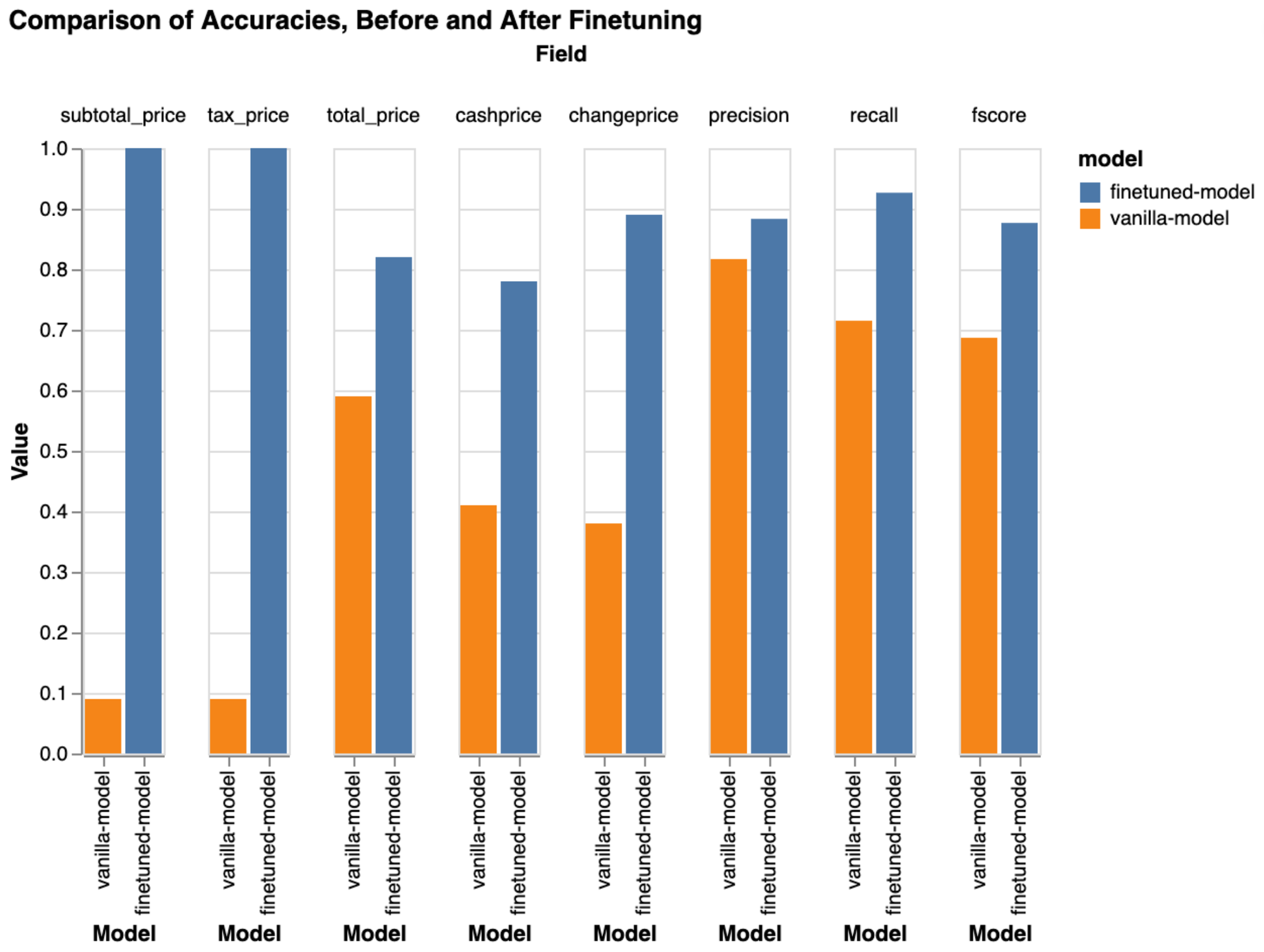 Once the model has been fine-tuned, the next step is to run predictions on your dataset to evaluate how well it has adapted. We will compare the previous results under the group vanilla-model and the latest outcomes under the group finetuned-model.