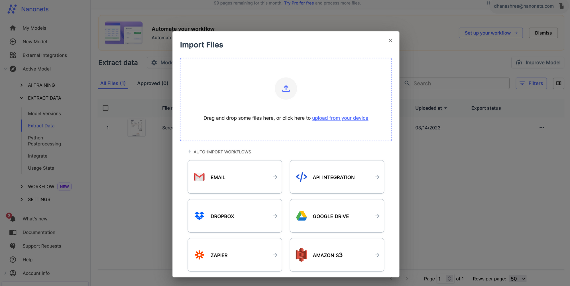 - You don't have to upload images manually, you can automatically upload documents to Nanonets using email, drive, dropbox, API or Zapier.