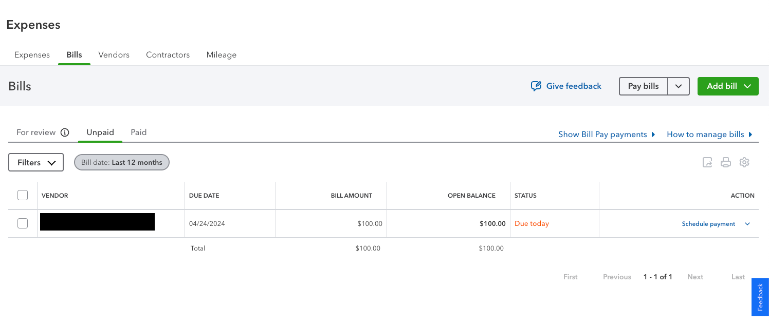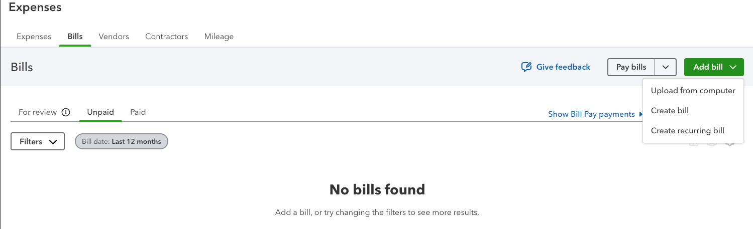 - You’ll want to first navigate to Expenses in the sidebar, then click Bills to open the vendor payment management dashboard.
