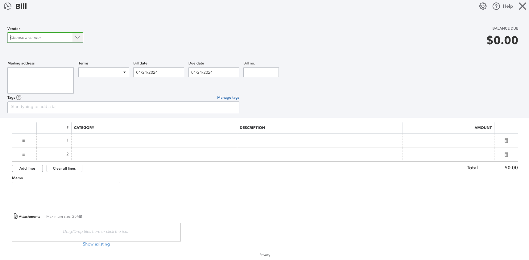 - You’ll then see a blank bill window and plug in all relevant vendor information within the entry fields.