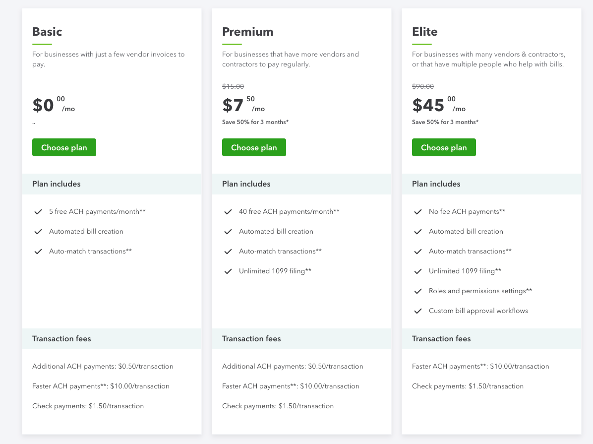 The lowest tier, Basic, is free but offers just five free monthly ACH payments. Beyond that, you’ll pay $0.50 per ACH payment and can elect to pay $10 per transaction to expedite ACH payments. Check payment processing is $1.50 per check.