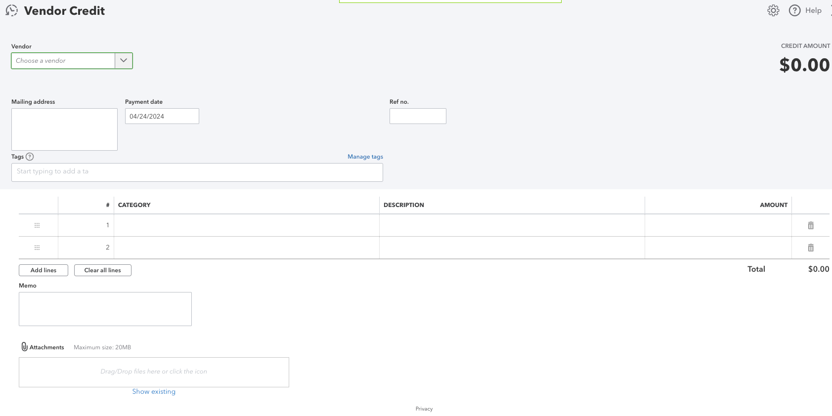 - Then select Vendor Credit. You’ll see the vendor portal where you can enter all relevant data.
