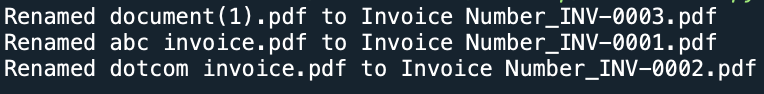 If an invoice number is found, the file is renamed accordingly. For example, the file named document(1).pdf will be renamed to Invoice Number_INV-0003.pdf.