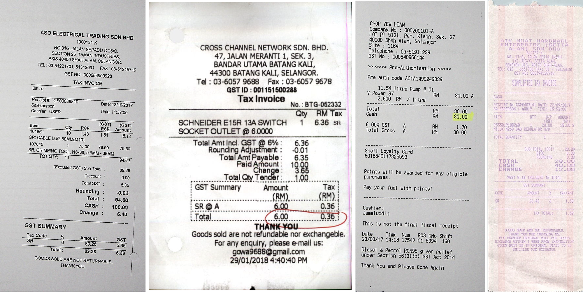 - Receipts: Printed transaction slips with varying fonts, noise, and faded text.