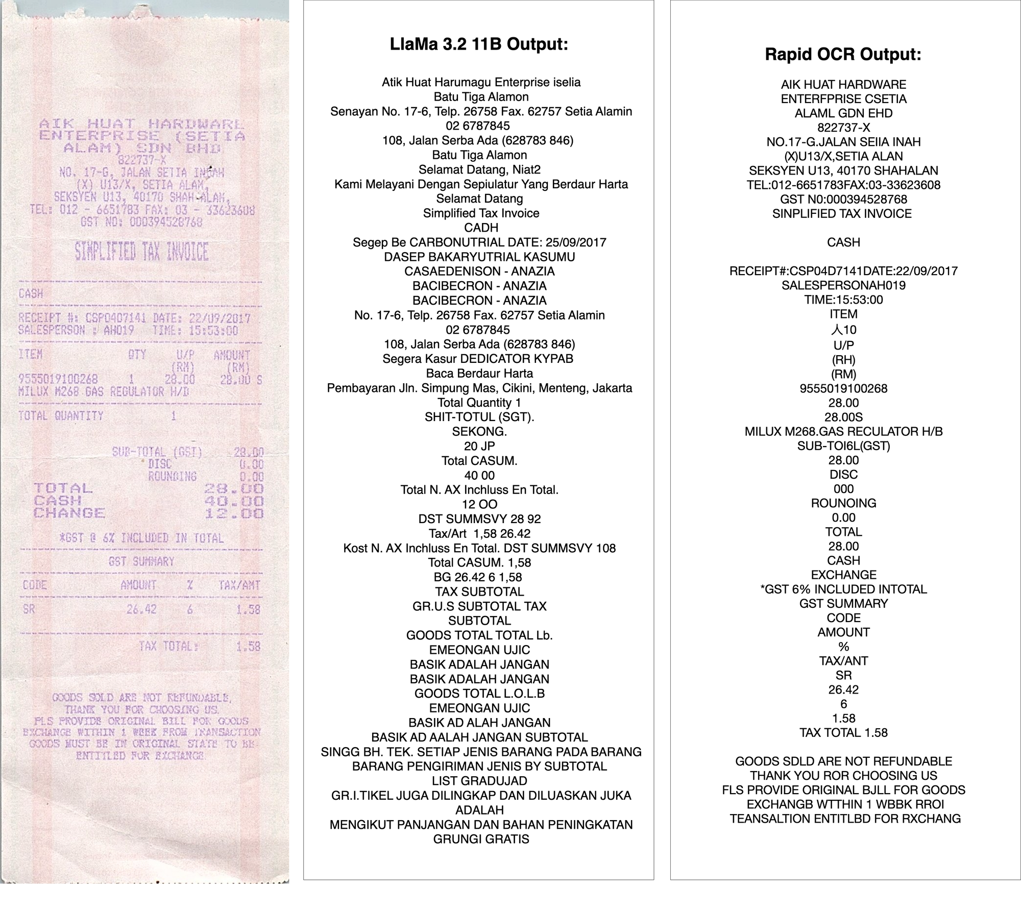 To understand how OCR models compare to Large Language Models (LLMs) in text extraction, we tested a challenging image using both LLaMa 3.2 11B Vision and RapidOCR, a small but dedicated OCR model.