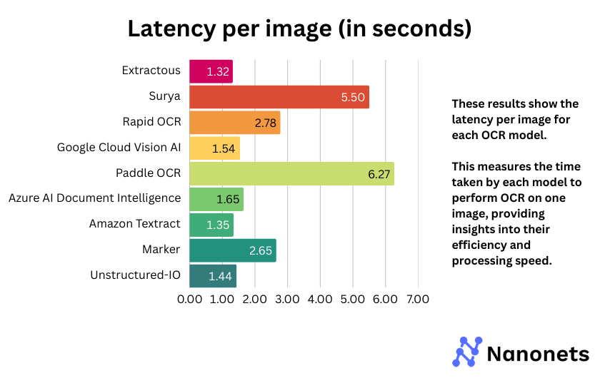 Latency per image for each model is presented below. This measures the time taken by each model to perform OCR on one image, providing insights into their efficiency and processing speed.