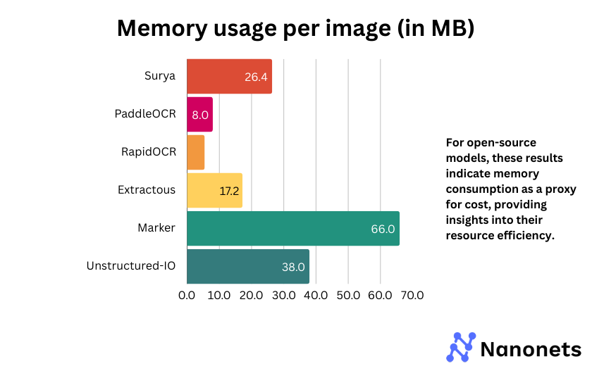 Among open-source models, Marker and Unstructured-IO have significantly higher memory consumption, which may impact deployment in resource-constrained environments. Surya and Extractous strike a balance between performance and memory efficiency. PaddleOCR and RapidOCR are the most lightweight options, making them ideal for low-memory scenarios.
