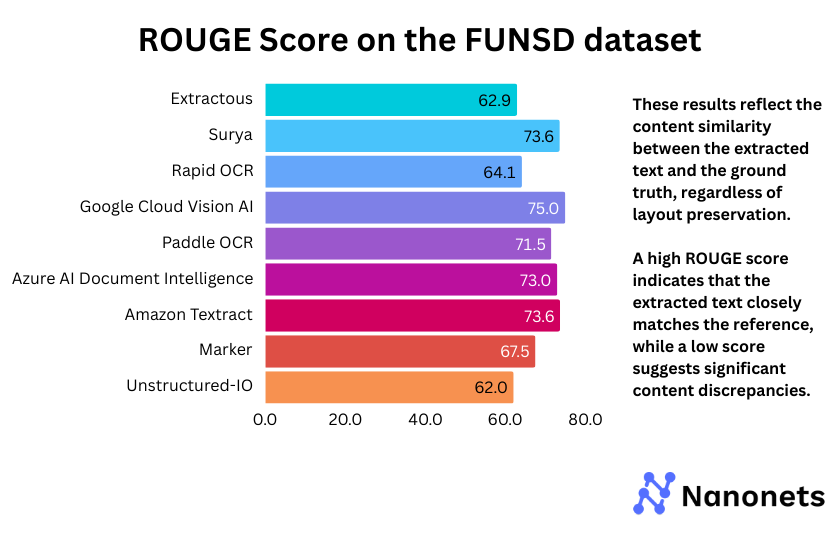 The ROUGE scores reveal that Google Cloud Vision AI consistently outperforms other models across both FUNSD (75.0%) and STROIE (87.8%), indicating superior text extraction. Surya and Marker, which rely on the same backend, show comparable performance, though Marker slightly lags on STROIE (70.3%). Extractous and Unstructured-IO score the lowest in both datasets, suggesting weaker text coherence. PaddleOCR and Azure AI Document Intelligence achieve balanced results, making them competitive alternatives. The overall trend highlights the strength of commercial APIs, while open-source models exhibit mixed performance.