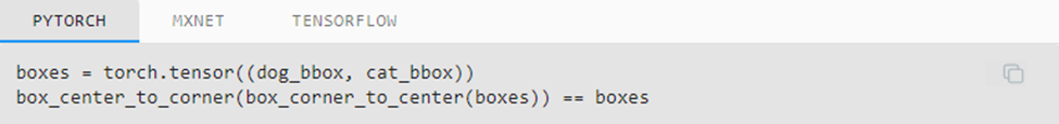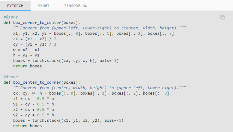 Next, we define two functions to convert these forms: box_corner_to_center converts the two-corner representation to the center-height-width representation and box_center_to_corner does it vice-versa.
