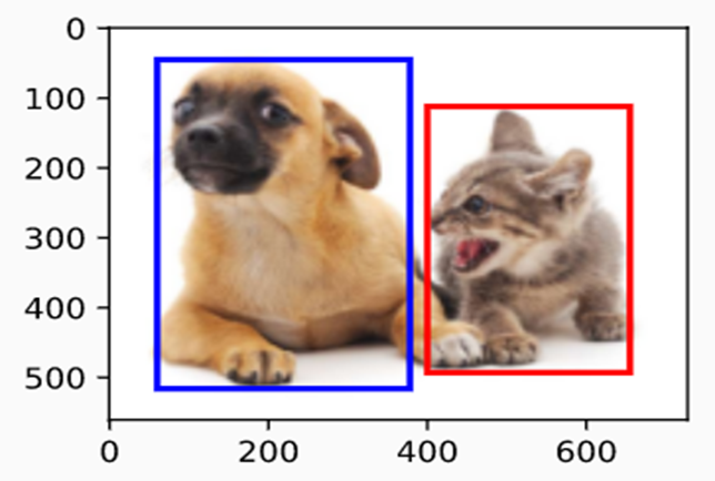 Now, after adding the bounding boxes of the dog and cat objects to the image, we see that the main outline of these objects is within the two boxes.