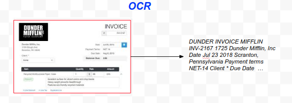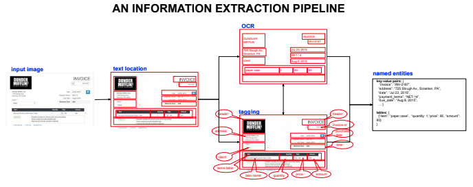 The following picture shows an Receipt IE pipeline, in which each text area of interest found by OCR is tagged with label indicating what class of information it contains, for instance “Amount Due”, “Address” or “Date”.