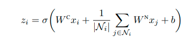 where Ni is the set of neighbors of node i, WC is the weight matrix associated with the center node, WN is the weight matrix associated with neighboring nodes, and b is a vector of biases, one for each filter. The dimensionality of the weight matrices is determined by the dimensionality of the inputs and the number of filters.