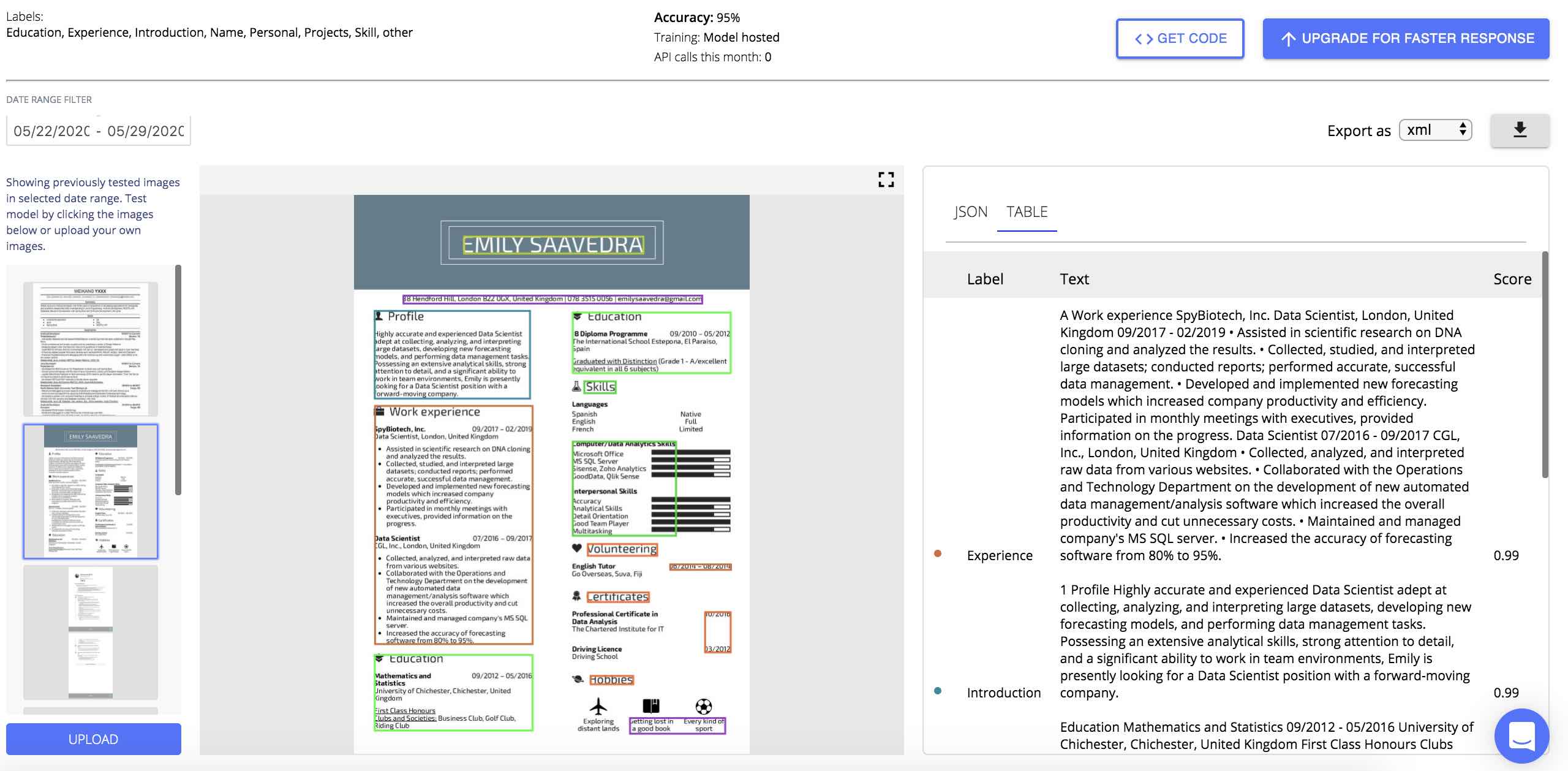 For resume parsing using Object detection, page segmentation is generally the first step. The main goal of page segmentation is to segment a resume into text and non-text areas. Later, we extract different component objects, such as tables, sections from the non-text parts. Unlike traditional rule-based methods where a lot of parameters are involved, the main goal of learning-based (CNN in this case) methods is to split document pages into lines at first, then to classify each line and combine the classification results by different rules.