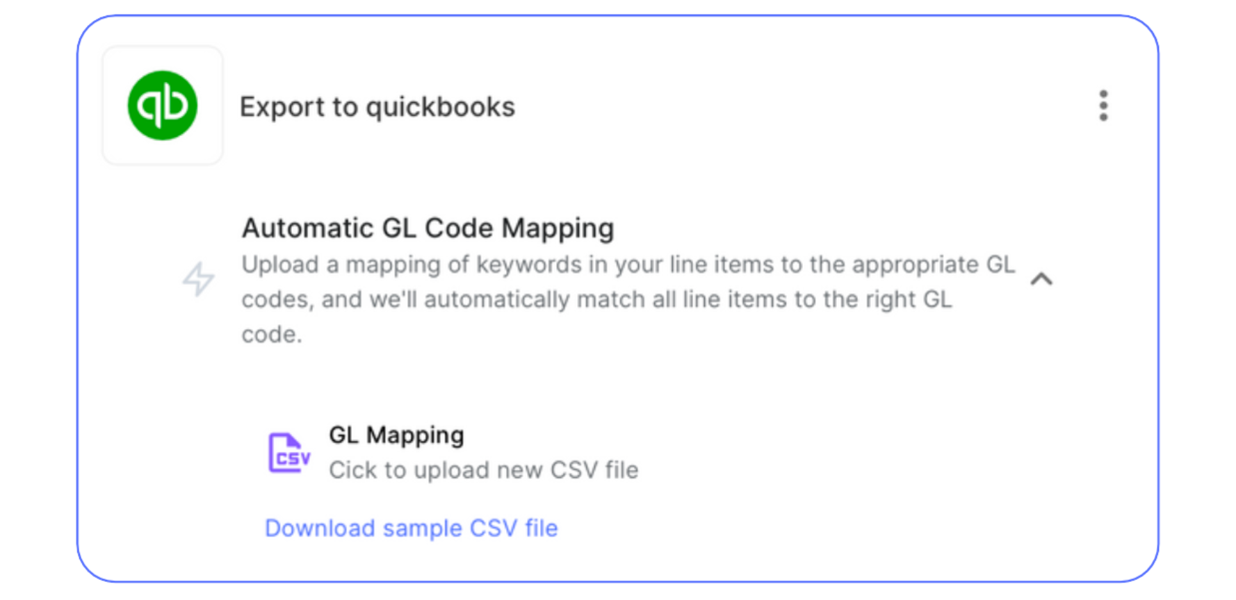 - Upload your chart of accounts and set up automated GL coding within the QuickBooks export card.