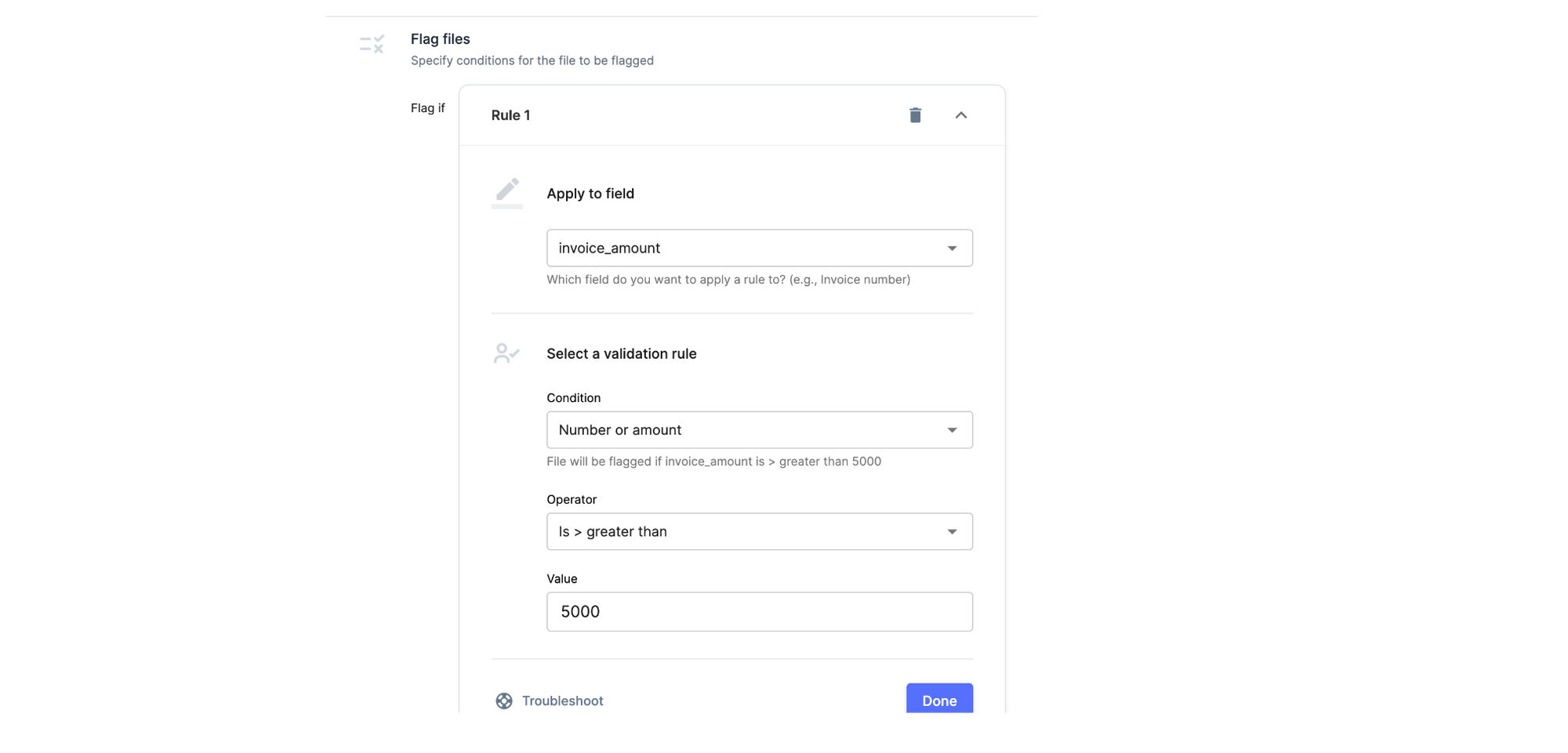 - Add Rules to flag the files. Example: Set up a rule to flag files if Invoice_amount is > 5000.