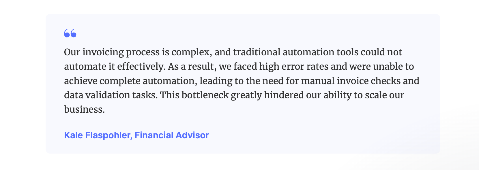With traditional automation tools, Pro Partners Wealth saw a high error rate which required them to manually check each invoice and validate them based on their business rules. They had to further do manual processing in feeding this validated data to their accounting software - Quickbooks.
