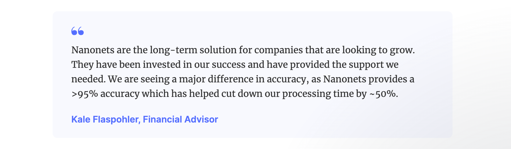 Pro Partners Wealth is in a growth phase, so they needed to remove bottlenecks that were reducing their efficiency. Their traditional OCR tool couldn’t provide a long-term solution due to slow processing times and a lack of customizations and support. With the implementation of Nanonets, they immediately received the support needed to address issues quickly and customize the product to reduce turnaround times further.