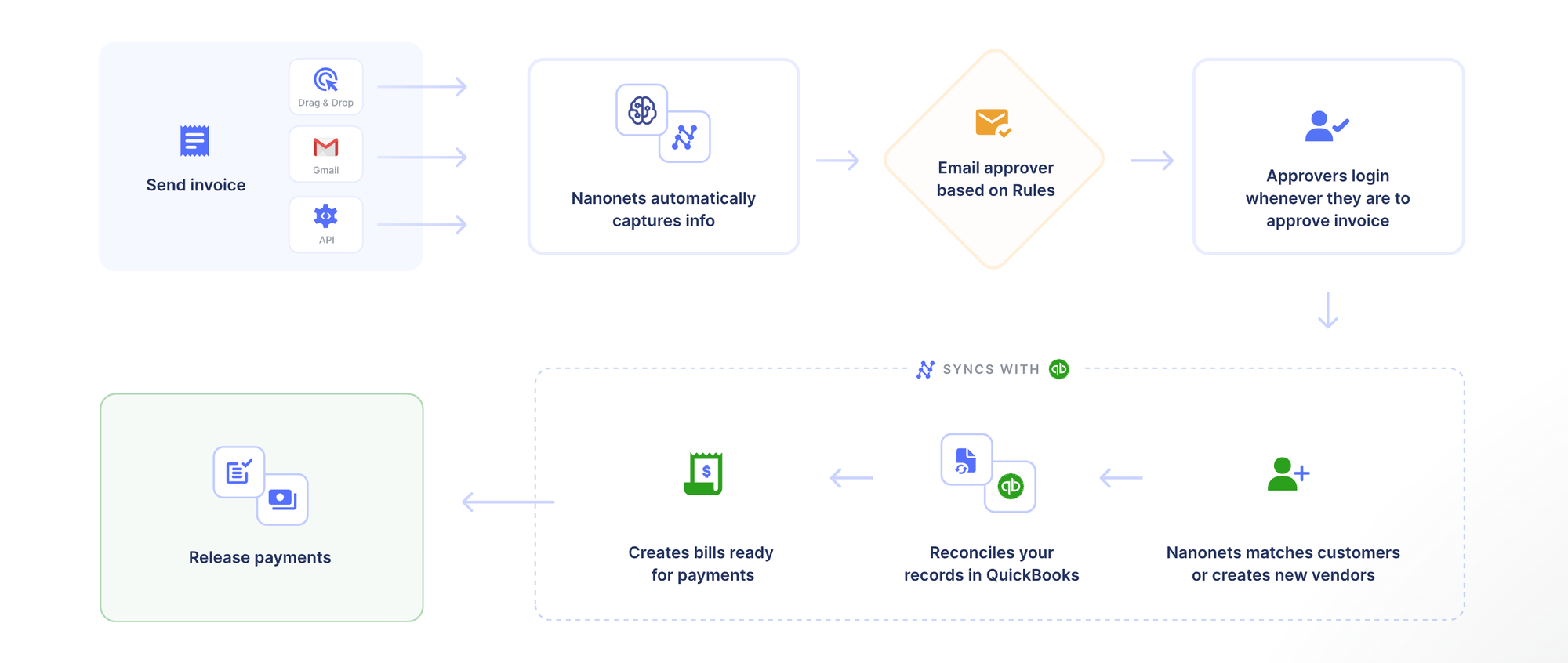A fully automated invoice processing Nanonets workflow integrated with QuickBooks looks as follows.