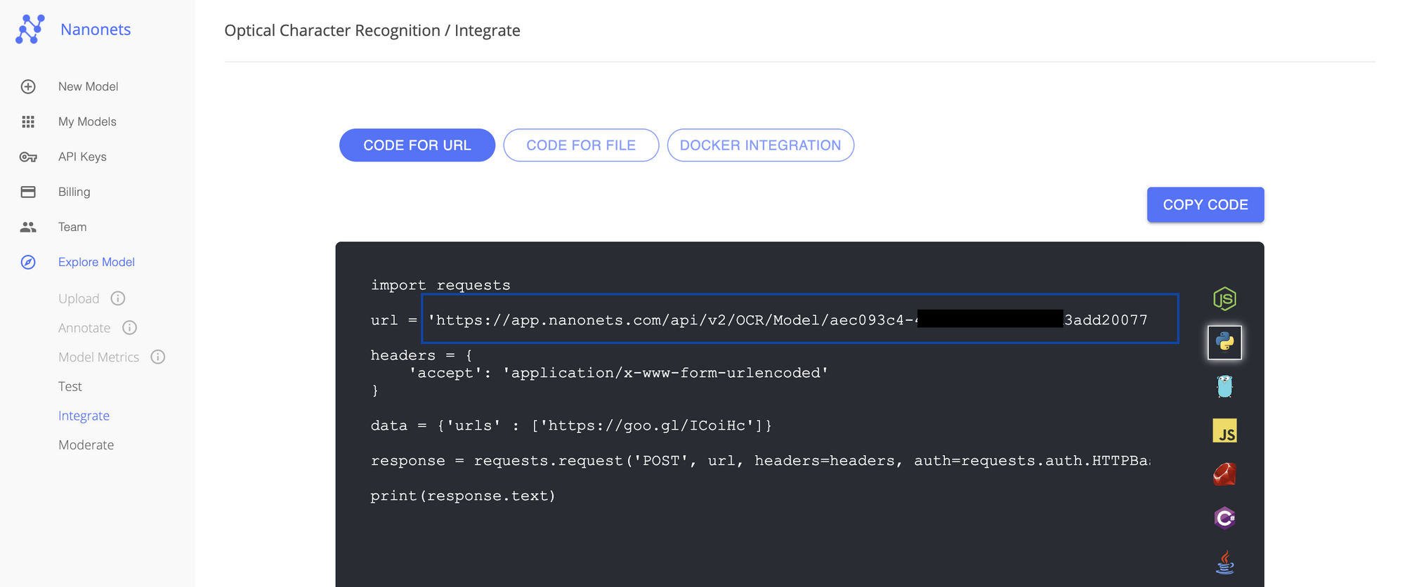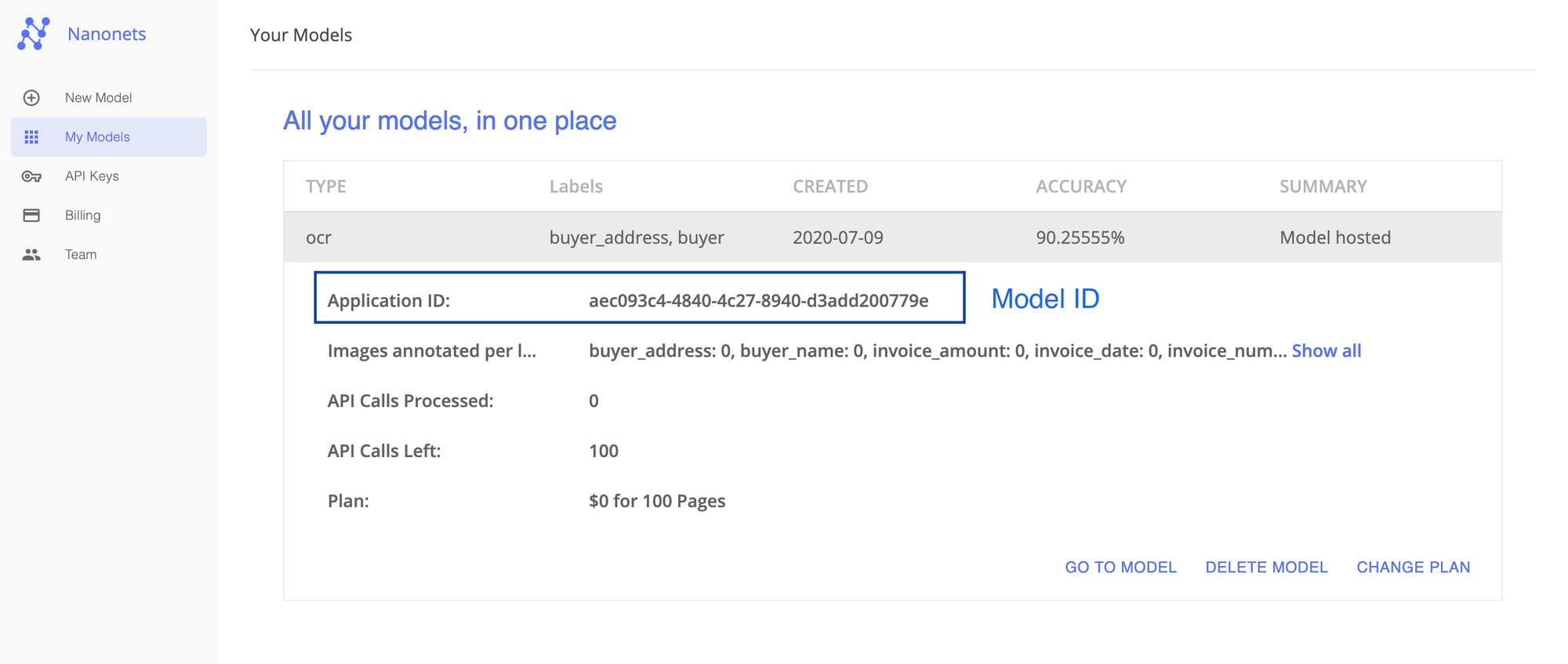 Model ID: Login to your Nanonets account and navigate to “My Models.” You can train a new model or copy the Application ID of an existing model.