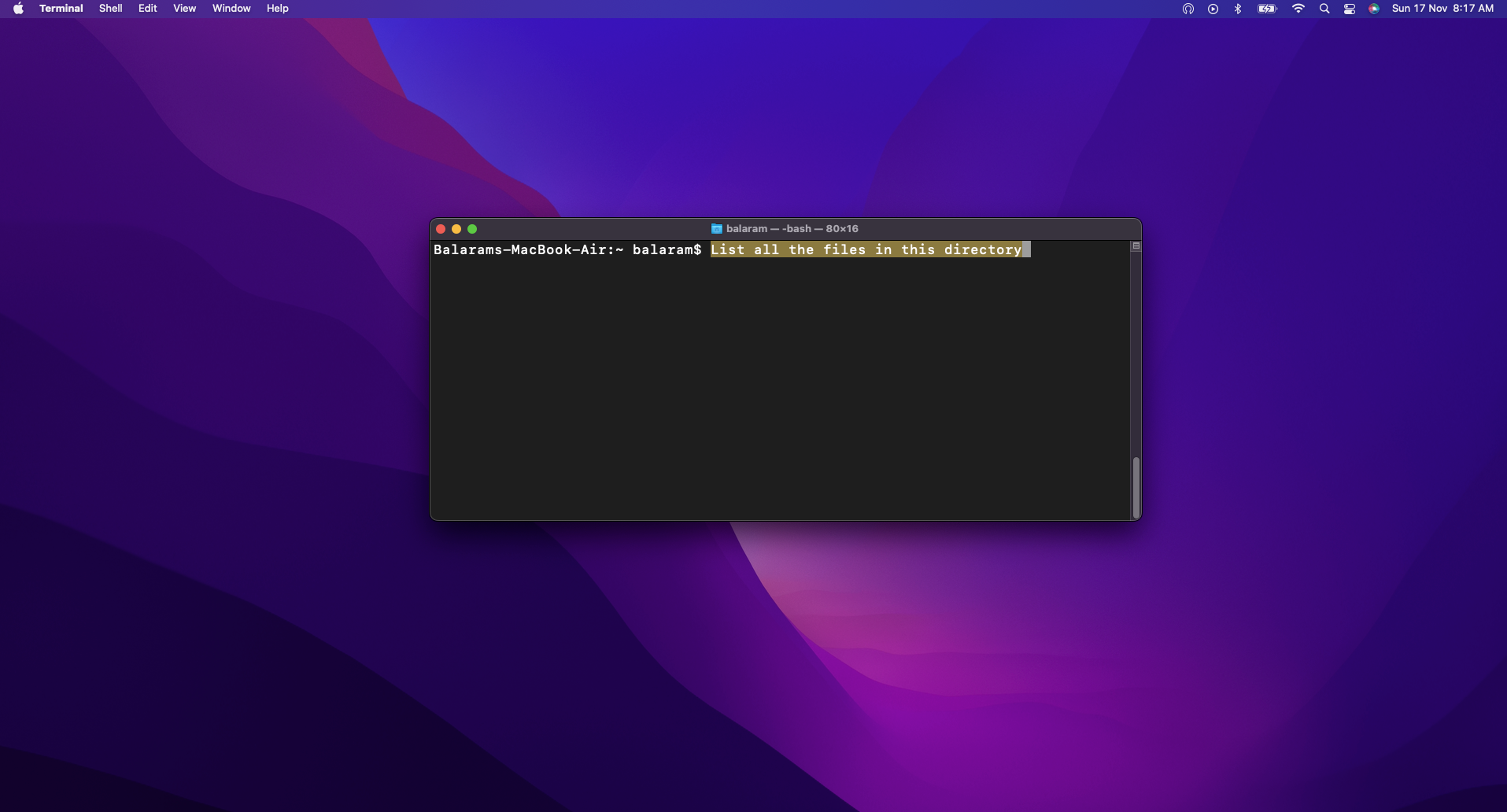 - Select Text: After writing the description of the command you need to perform in the terminal, select the text.