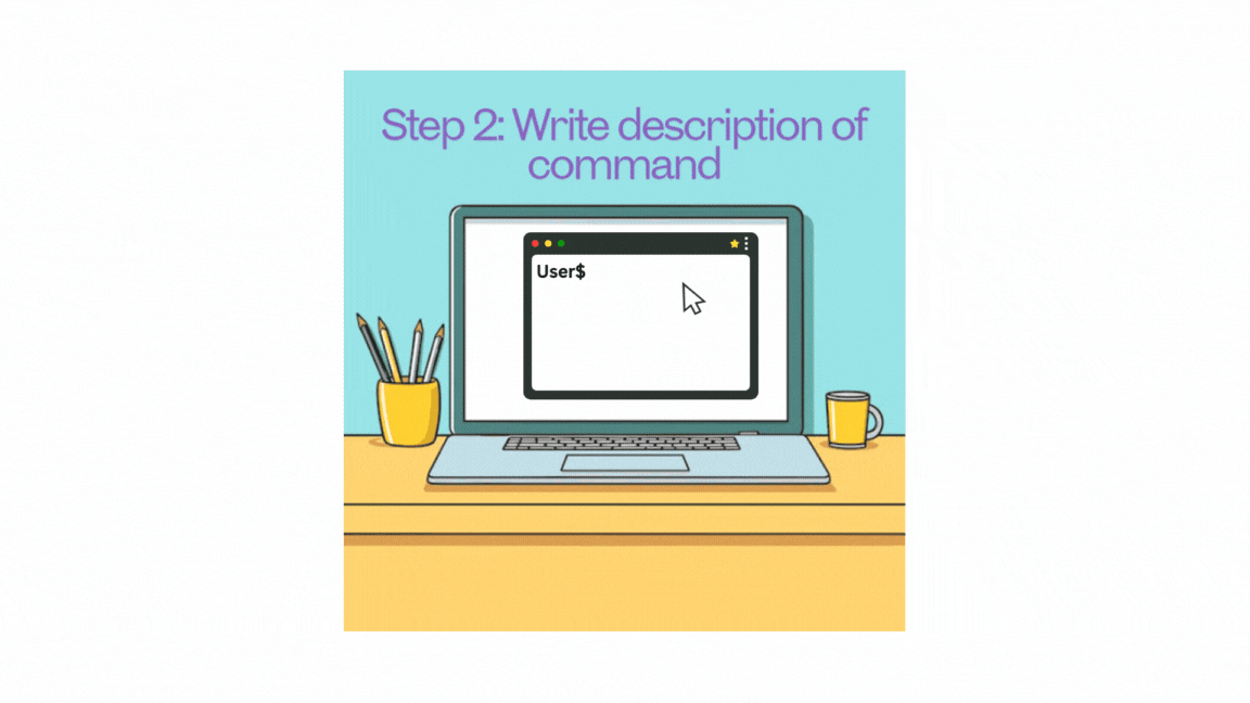 - Describe the Command: Write a clear and concise description of the task you want to perform in the terminal. For example, "Create a file named abc.txt in this directory."