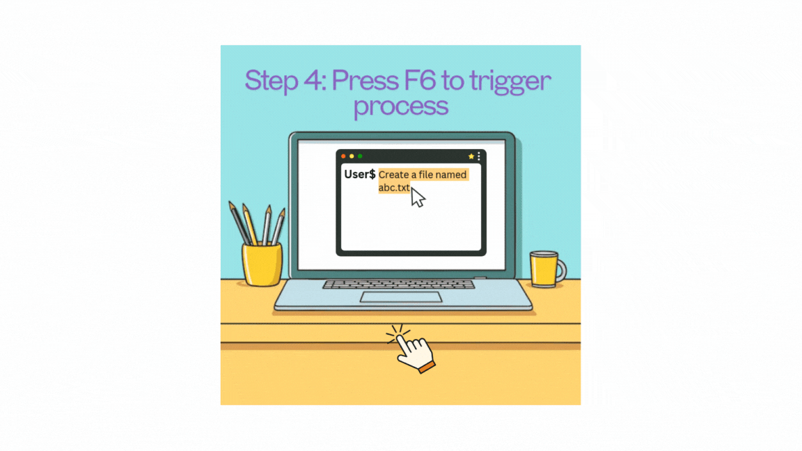 - Press Trigger Key: Hit the F6 key on your keyboard as default (can be changed as needed). This triggers the process, where the task description is copied, processed by the tool, and sent to the LLM for command generation.