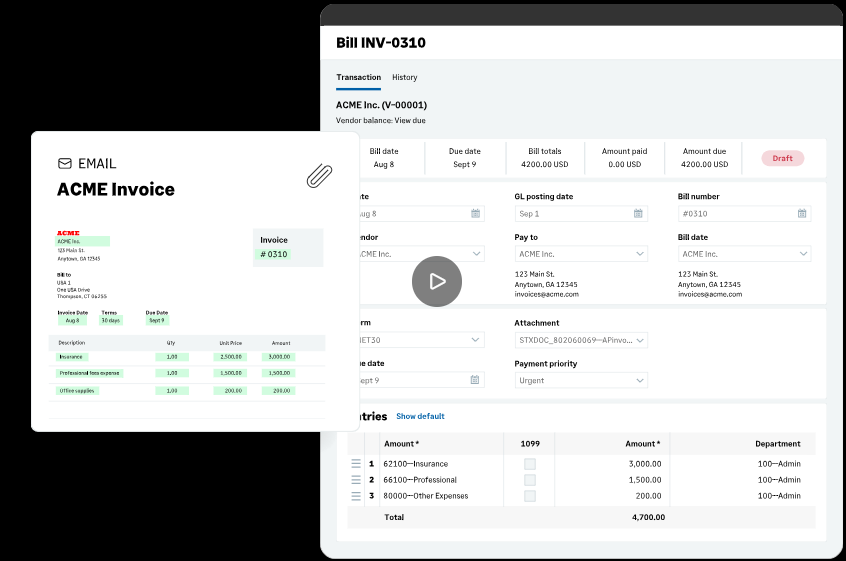 For example, when you receive an invoice via email, you can forward it to your dedicated Sage email address. The system reads the invoice, creates a draft bill with the vendor details, amount, and line items already filled in. You just need to review the details and approve.