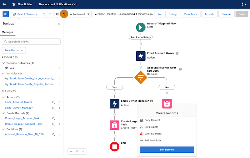 - Add criteria and actions, such as updating records or sending notifications.