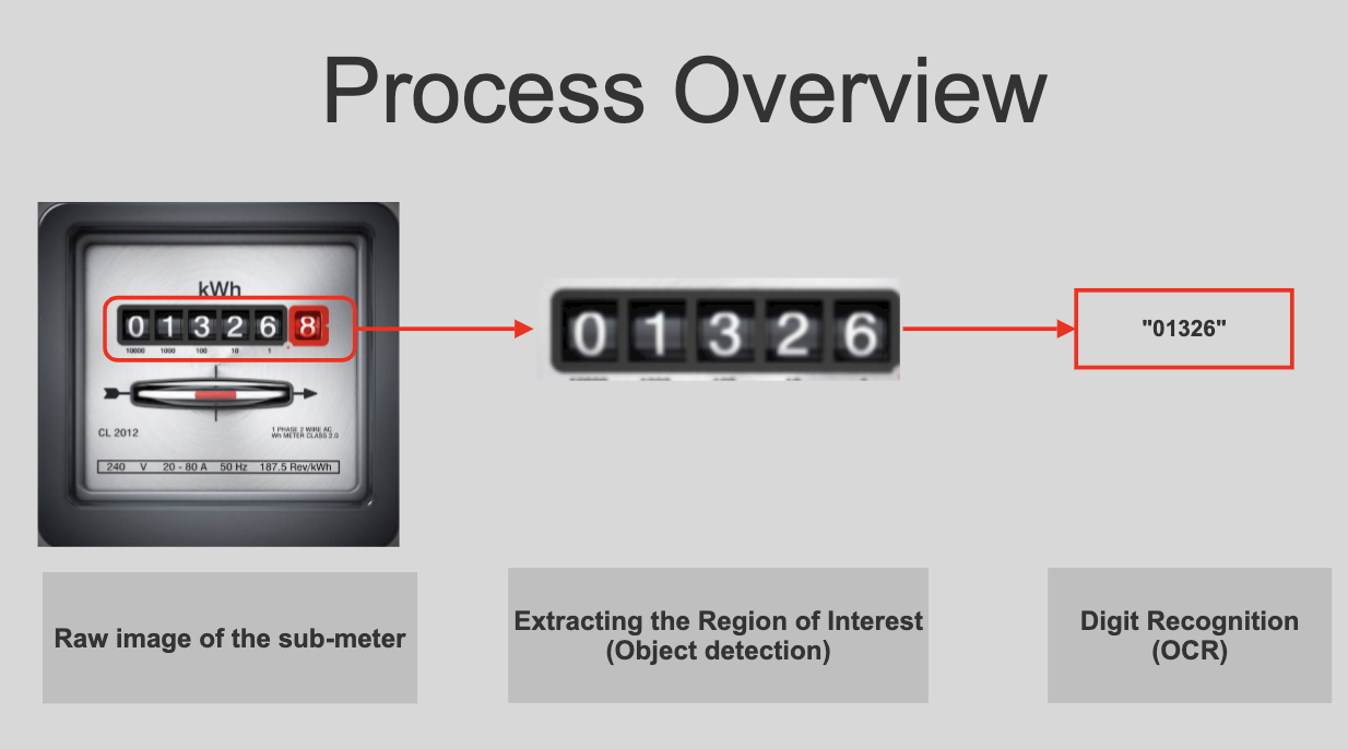 The process of getting the values from the images of the meter is two-fold. First, we need to detect the areas where the text is and extract the coordinates of the bounding box. This cropped area is then passed through a text recognition algorithm to give us the final output.