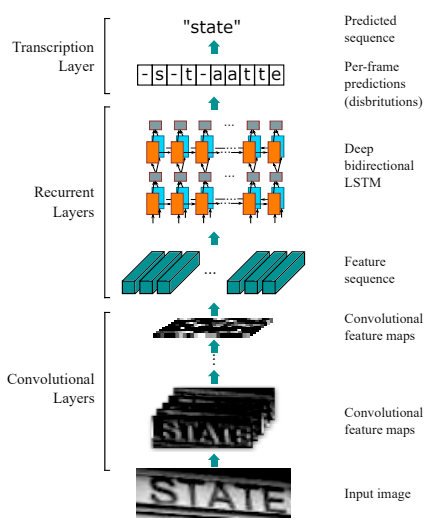 The pre-processed image is fed the the network in which the first layer is comprised of a Convolutional Neural Network which divides the image into feature columns, i.e., convolutional feature maps and then fed into a bi-directional LSTM sequence as a feature sequence. This recurrent neural network is responsible for outputting a sequence, intended for finding relations between characters. Finally, the output sequence which now consists of characters which may or may not have significance is passed onto the Transcription Layer, in which these characters are unified using a probabilistic method to extract information from the sequence.