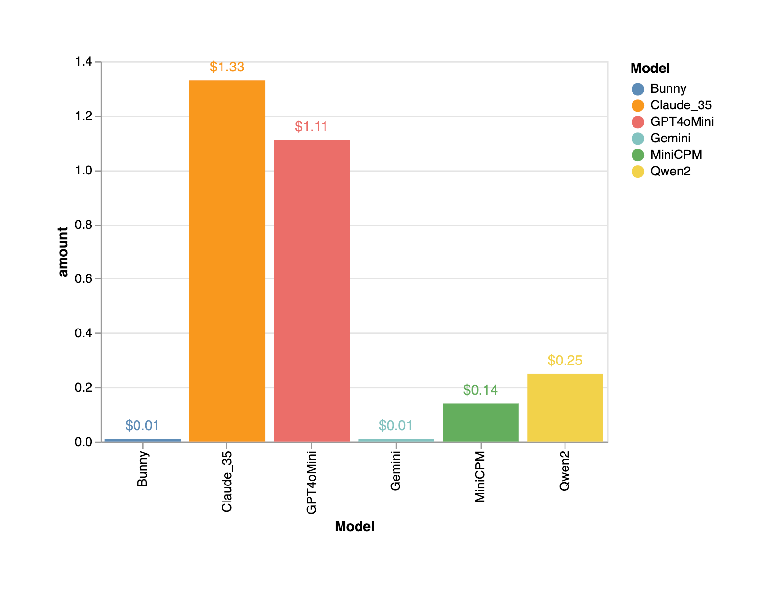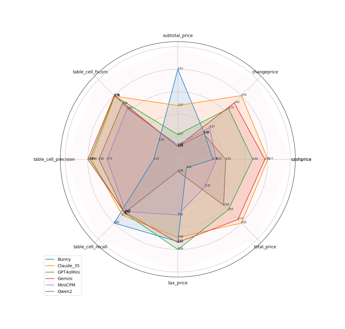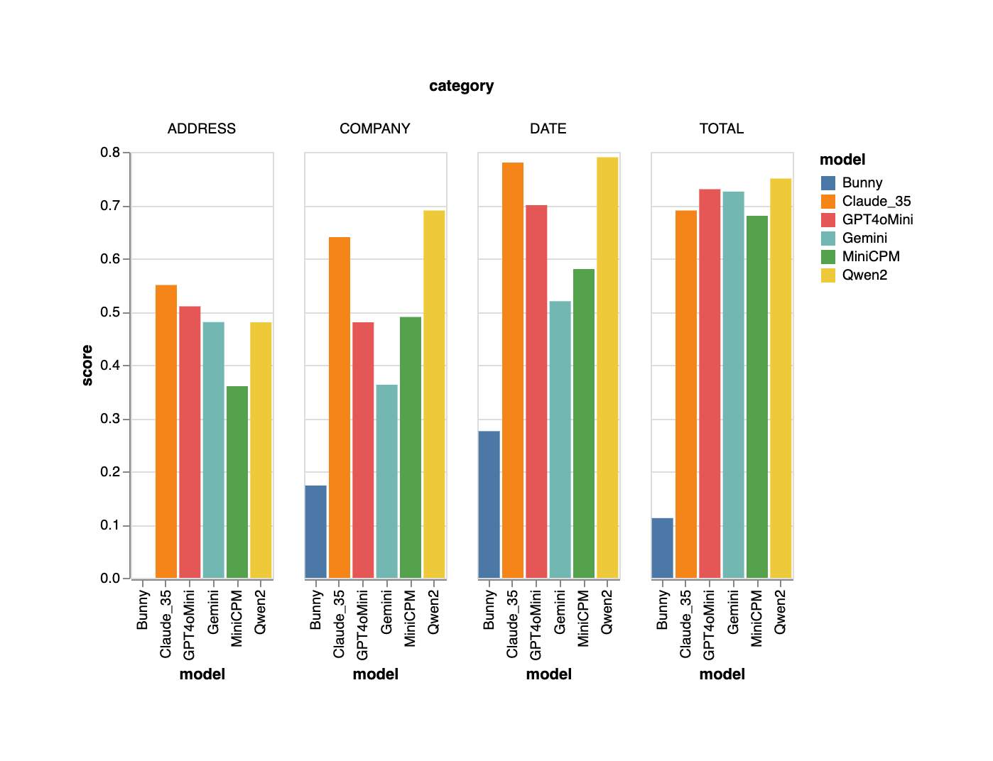 The Open Source VLMs are clearly showing their limitation in this dataset. Claude 3.5 is out performing the rest. Bunny is a curious case where the subtotal_price accuracy way ahead of others.
