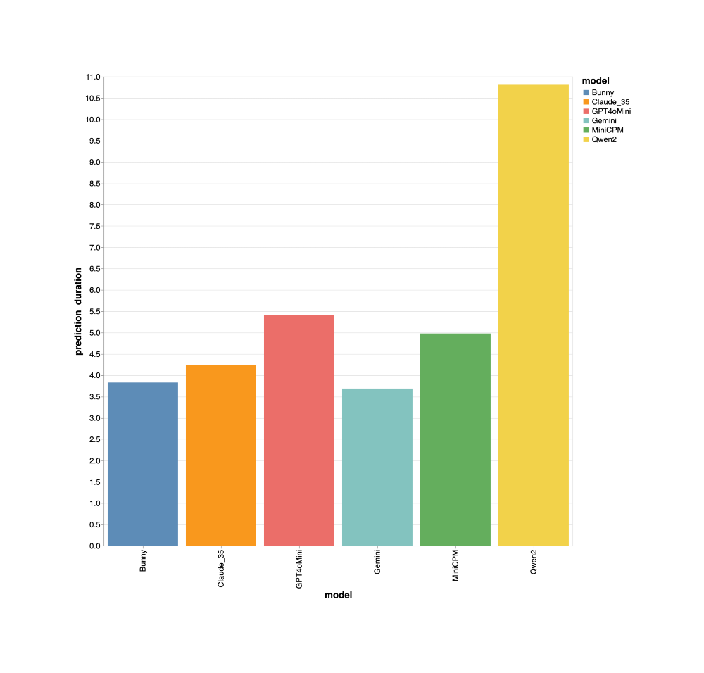 We used vanilla models and APIs out of the box for our predictions. All the models were in similar ballpark range of 3 to 6s with Qwen as the exception.