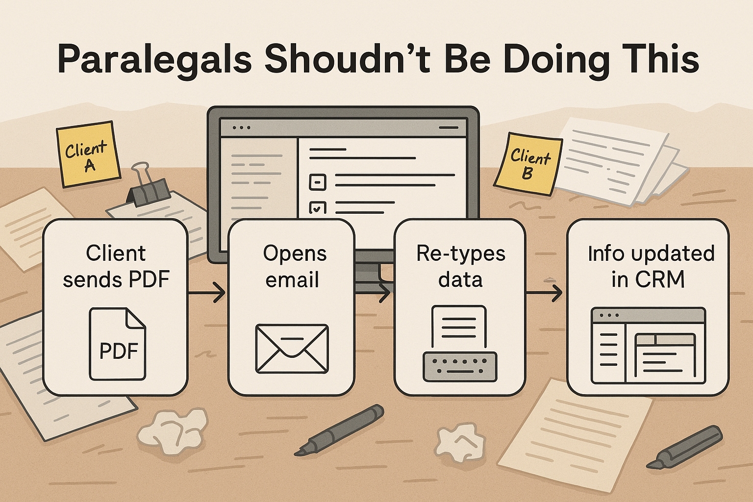 - Paralegals toggling between scanned documents and CRMs to retype client names, dates, and trust values.