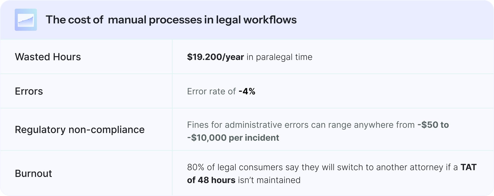 - Burnout: Staff frustration rises when highly qualified legal professionals are stuck with clerical work. That leads to turnover, hiring headaches, and training costs.