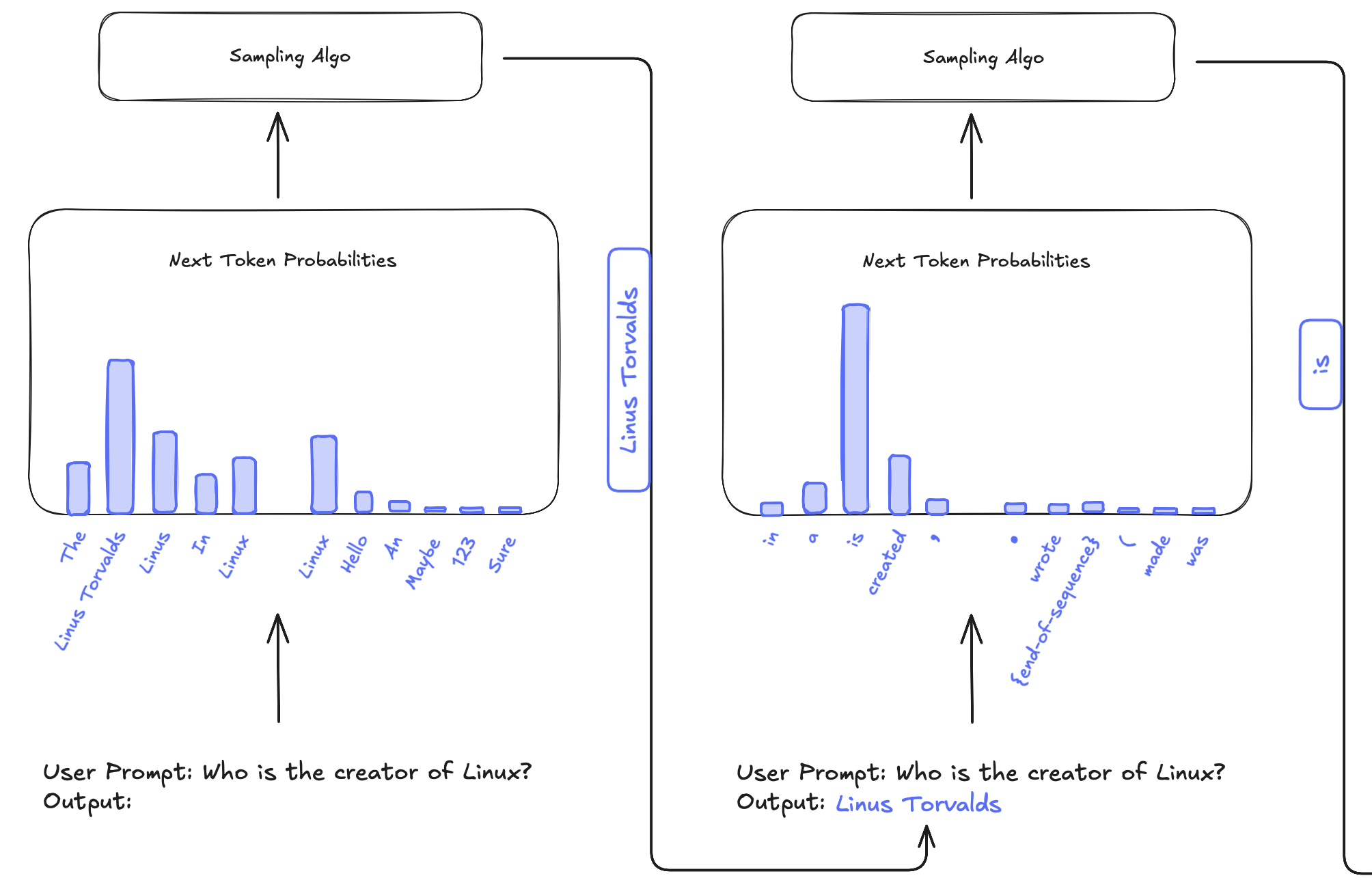 - picks a token from the probability distribution to be the next token, using a sampling algorithm.