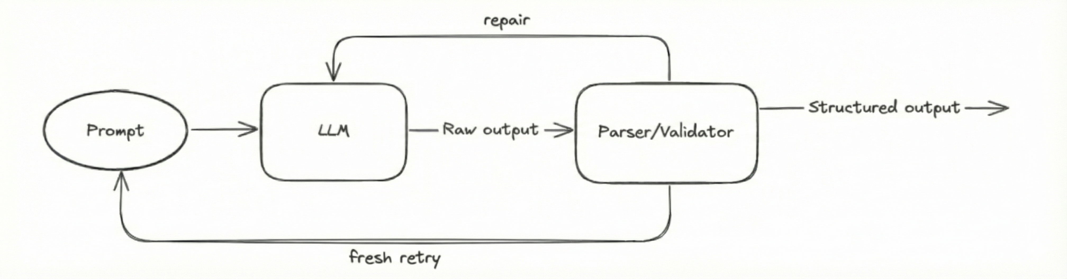 Now we need to handle bad outputs. We'll feed the LLM outputs to a parse-and-repair pipeline: