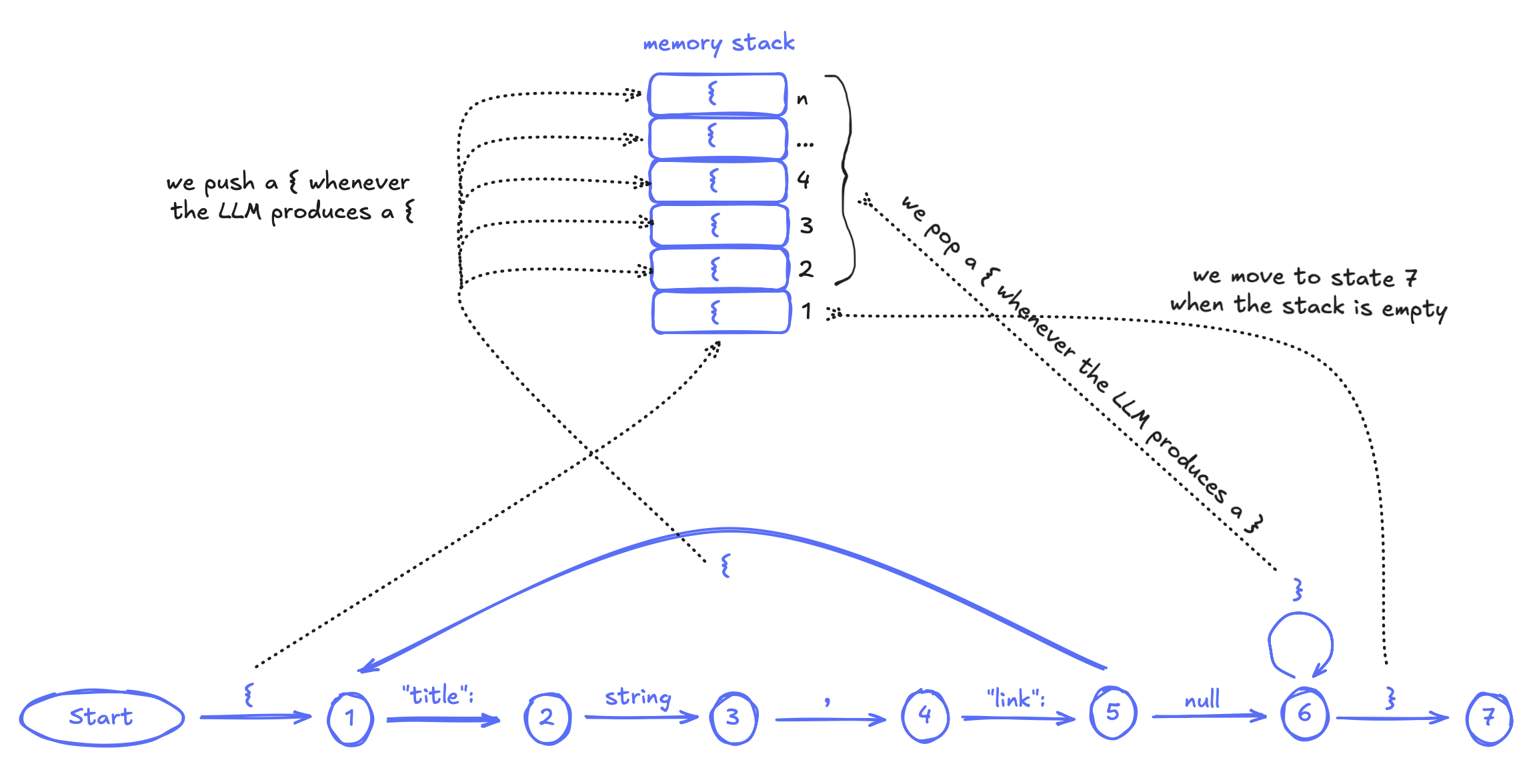 A constrained decoding backend converts CFGs into Pushdown Automata (PDAs), and uses the "memory" stack to track nesting depth, as shown above. Here's the PDA for our Wikipedia CFG: