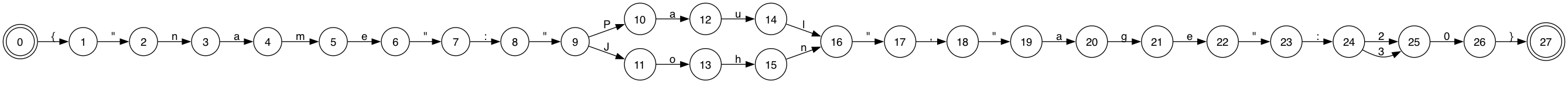 This is converted into an FSM, where the states represent the current state of the output, and the transitions represent valid characters that can be used to move to the next state.